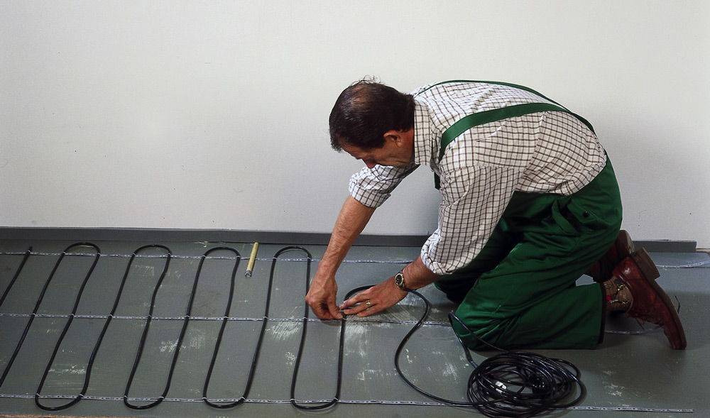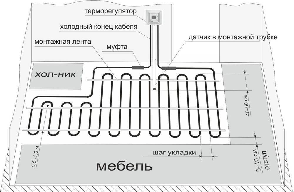 Важно при этом обратить внимание на шаг укладки кабеля. Минимальное расстояние между витками кабеля — 8 см. Монтаж производится в цементно-песчаную стяжку