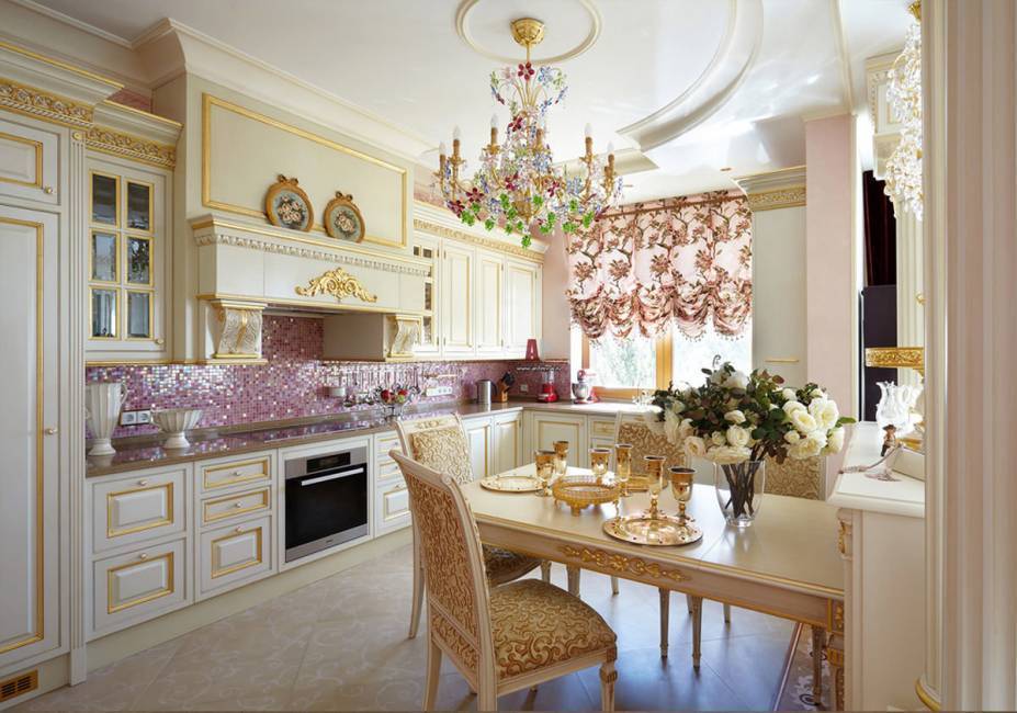 Классические элементы в кухонном интерьере подчеркнут традиционные люстры с хрустальными подвесками или в форме канделябров, светильники с тканевыми плафонами придутся к месту в гостиной в стиле классицизма.