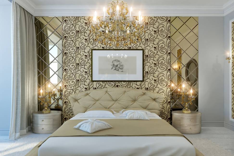 Для спальни подойдет осветительный прибор, который будет максимально создавать уют, и сочетаться даже в таких стилях как хай-тек, модерн с простой, функциональной мебелью. При выборе учитывается высота комнаты, цвет стен и всей мебели, размер спального места. Для этого помещения лучше выбрать люстру из хрусталя с функцией регулирования интенсивности света.