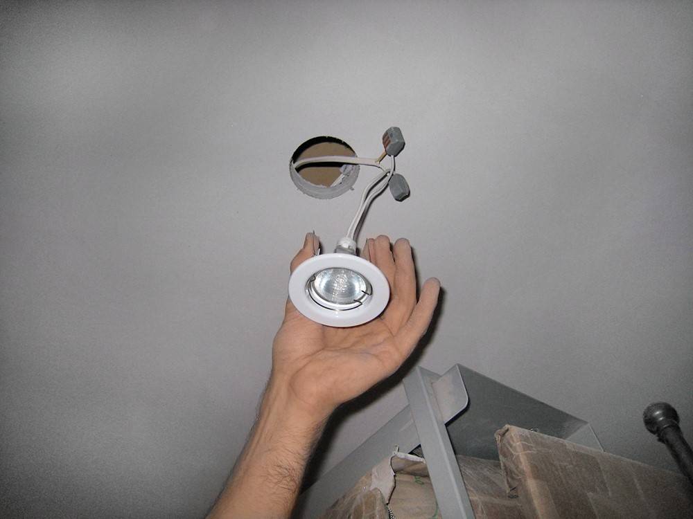 - Перед началом работы сеть освещения на потолке в целях безопасности надо обесточить. Над подвесными и натяжными потолками делается каркас с площадками для установки софитов, по которому надо вывести провода к местам подключения, учитывая запас на 10–15 см ниже уровня потолка. Это делается для удобного подключения разъемов и замены ламп или софита целиком.