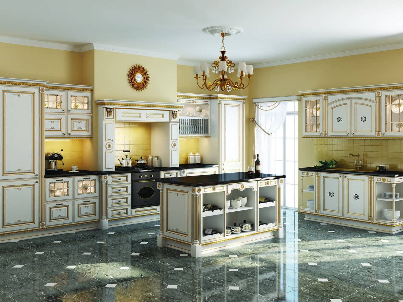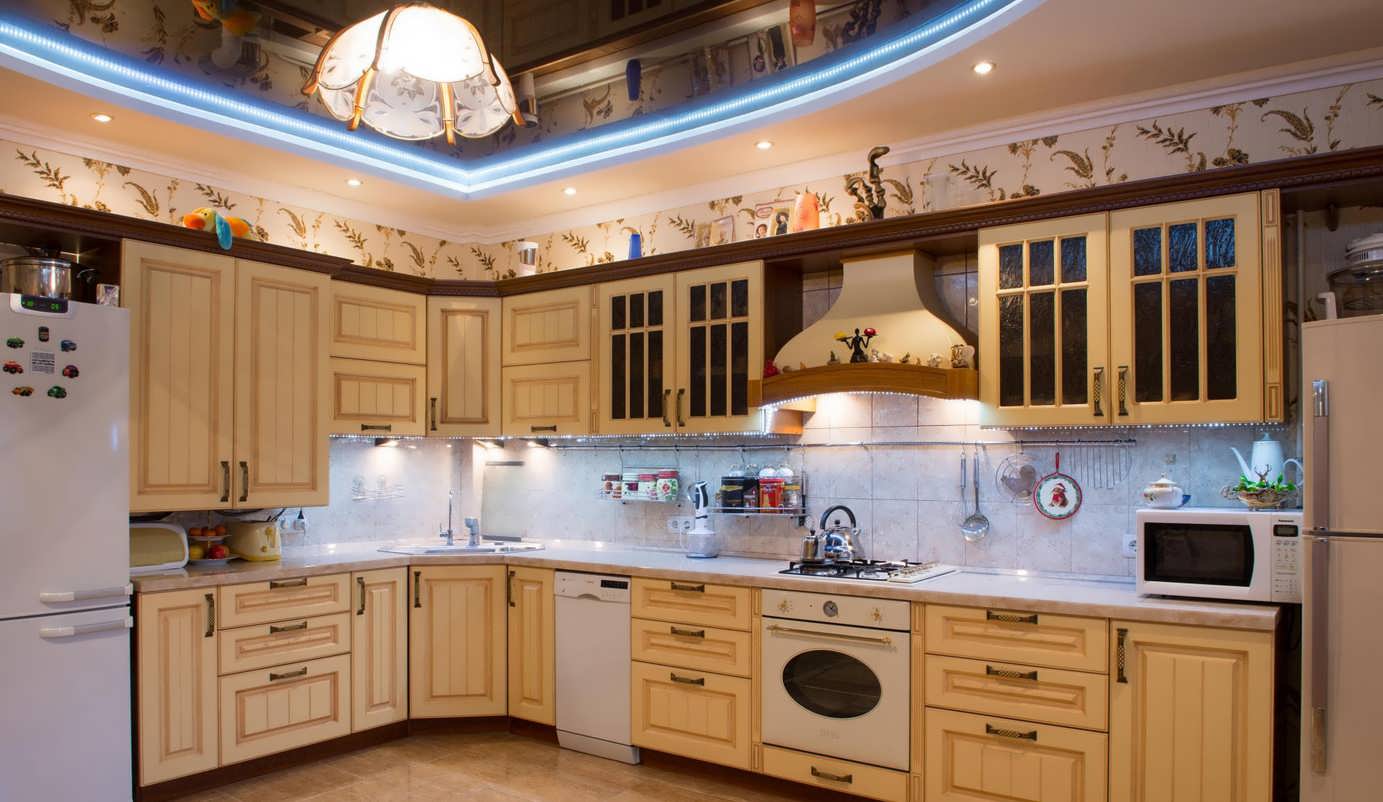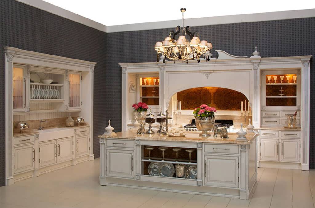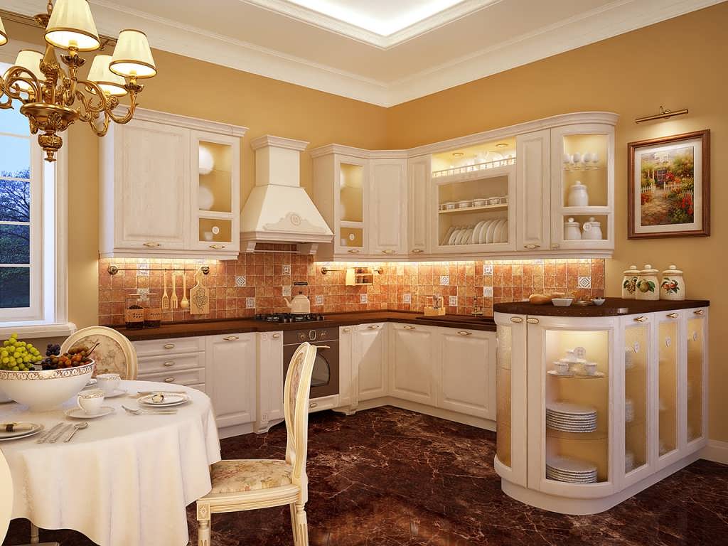 В центре комнаты поместите габаритную люстру, оформленную под классику или прованс. Подойдут варианты с подвесками, хрусталиками, коваными элементами. Остальные части кухни оформите небольшими светильниками.