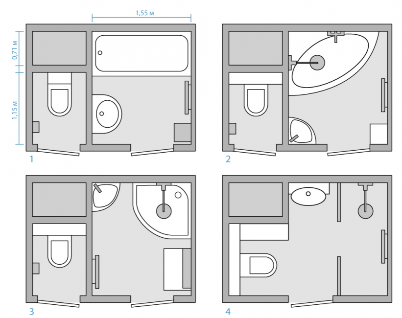 Лучшими размерами, которые подойдут для таких параметров ванной, является плитка, размеры которой составляют 15х30, 30х60, 45х45, 30х30, 60х60. Хорошо будут смотреться в общем дизайне серые и светло-бежевые оттенки.