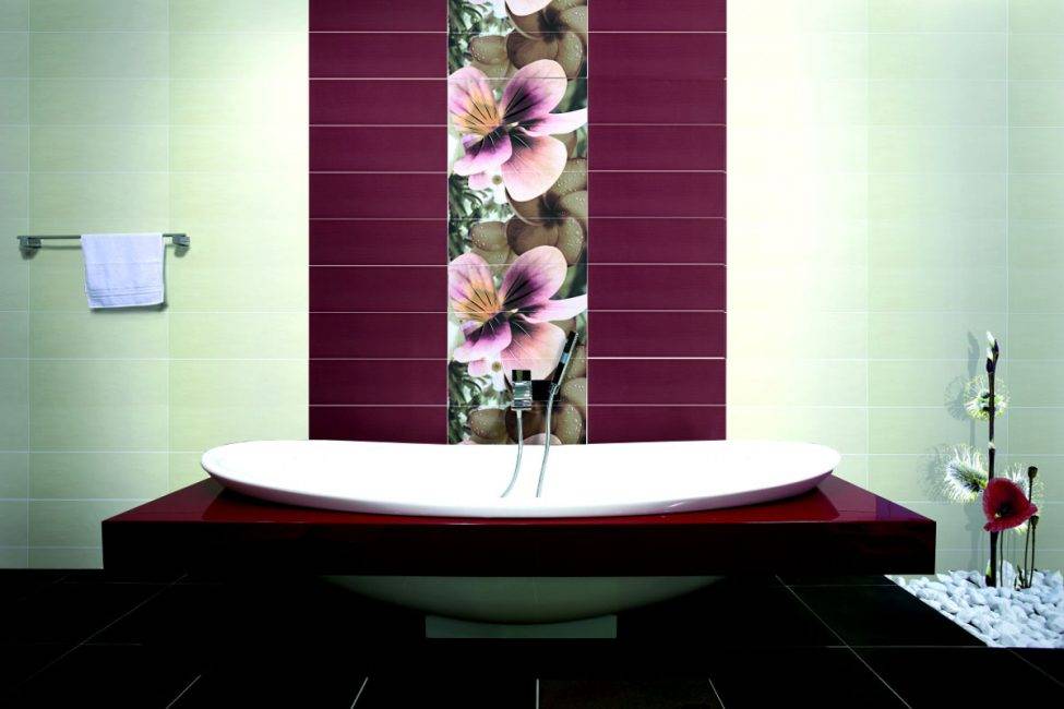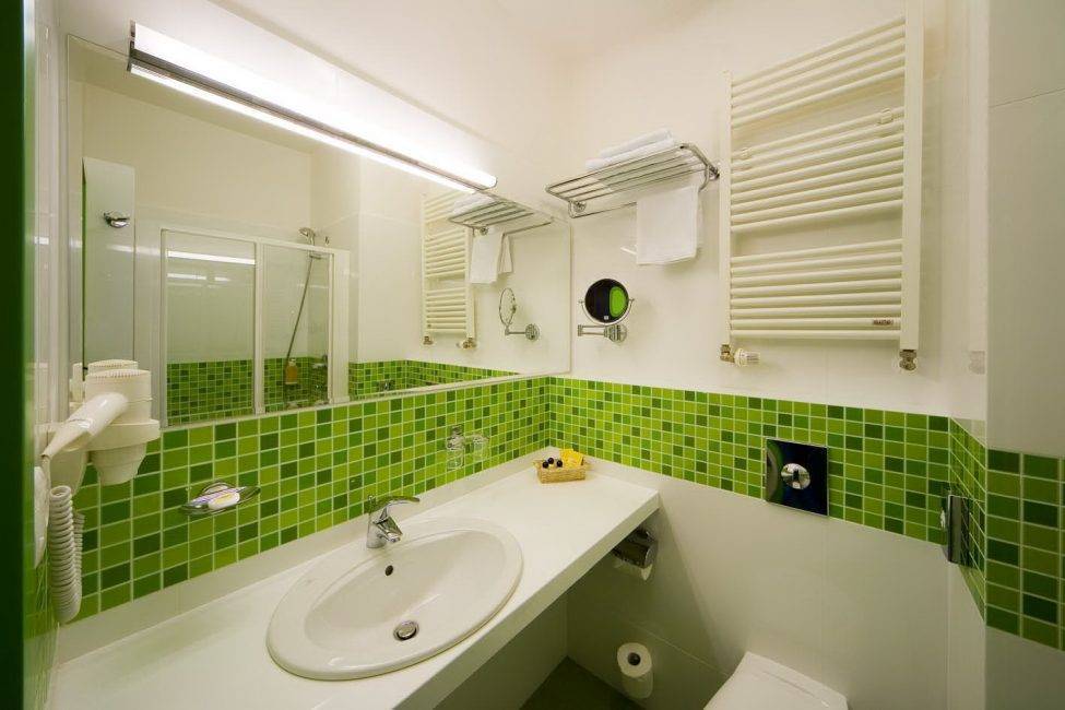 А вот зеленую плитку используются только для выделения нескольких акцентов. Общая площадь зеленого цвета редко превышает 20% от всей поверхности отделки. Для пола можно использовать яркие акцентирующие цвета или сочетаемые со стенами, но более темные.