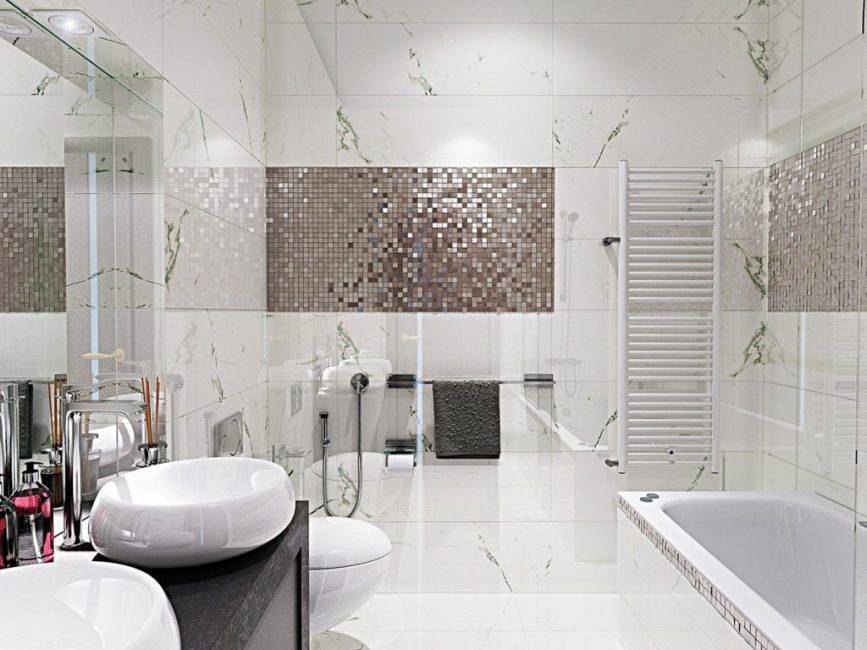 Кафельная плитка для ванной используется различных форм и размеров. Для пола подойдет крупный формат, для стен и ванны мозаика или среднего размера. Допускается сочетание нескольких размеров одновременно.