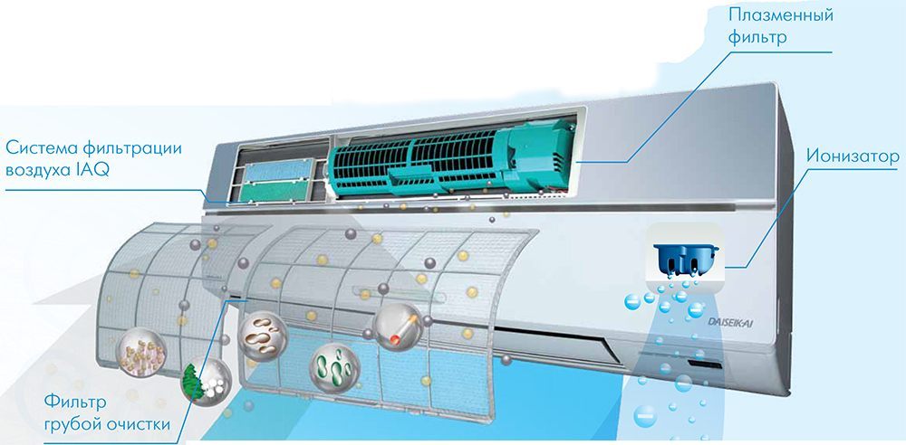 В бюджетных моделях установленных только фильтры грубой очистки от крупной пыли и волос домашних животных. Но есть кондиционеры с фильтрами тонкой очистки против бактерий, вирусов и посторонних запахов. Часто они оснащены плазменным, электростатическим или ультрафиолетовым фильтрующим элементом.