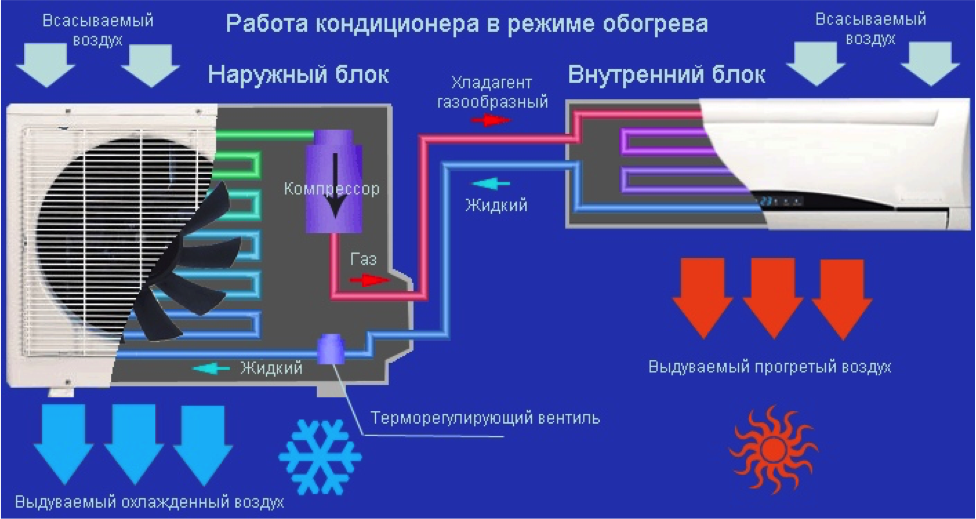 В режиме охлаждения хладагент, который находится в газообразном состоянии, поступает из испарителя в компрессор, где сжимается. При этом происходит его нагрев до +70 – +90°С. Далее хладагент попадает в конденсатор. Внешний воздушный теплообменник позволяет газообразному хладагенту превратиться в жидкий.