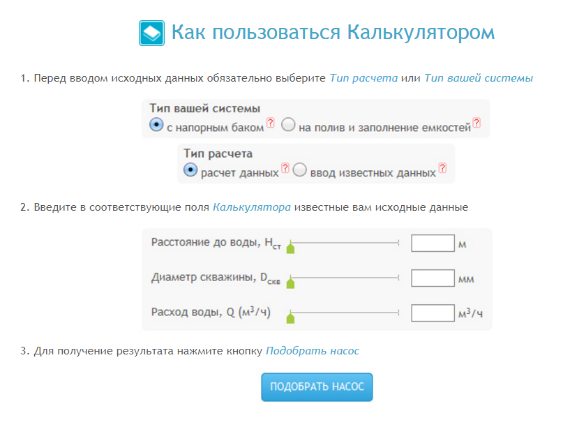 Рис. 2 Онлайн — калькулятор для расчета насоса для водоснабжения