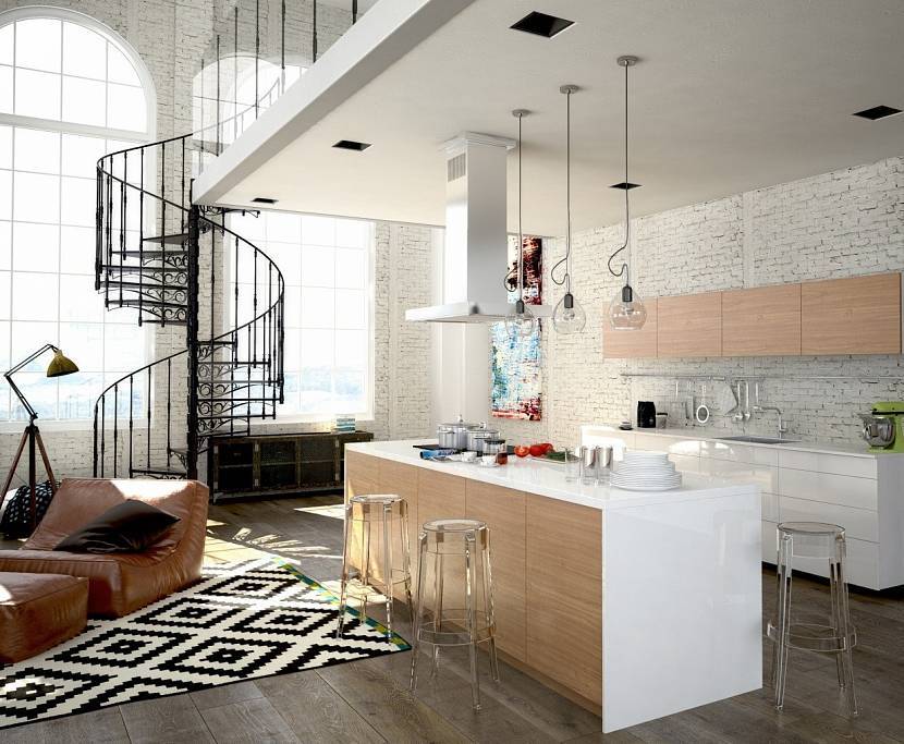 Обязательным элементом в доме станет лестница. Если квадратов в доме не так много, ее можно вынести на улицу, когда же площадь позволяет установить ее в доме, то необходимо максимально продумать ее месторасположение – она не должно скрадывать пространство. Рационально также использовать лестницу как дополнительное место хранения – под ней вполне компактно может разместиться масса самых различных шкафчиков и выдвижных систем.