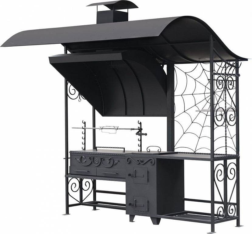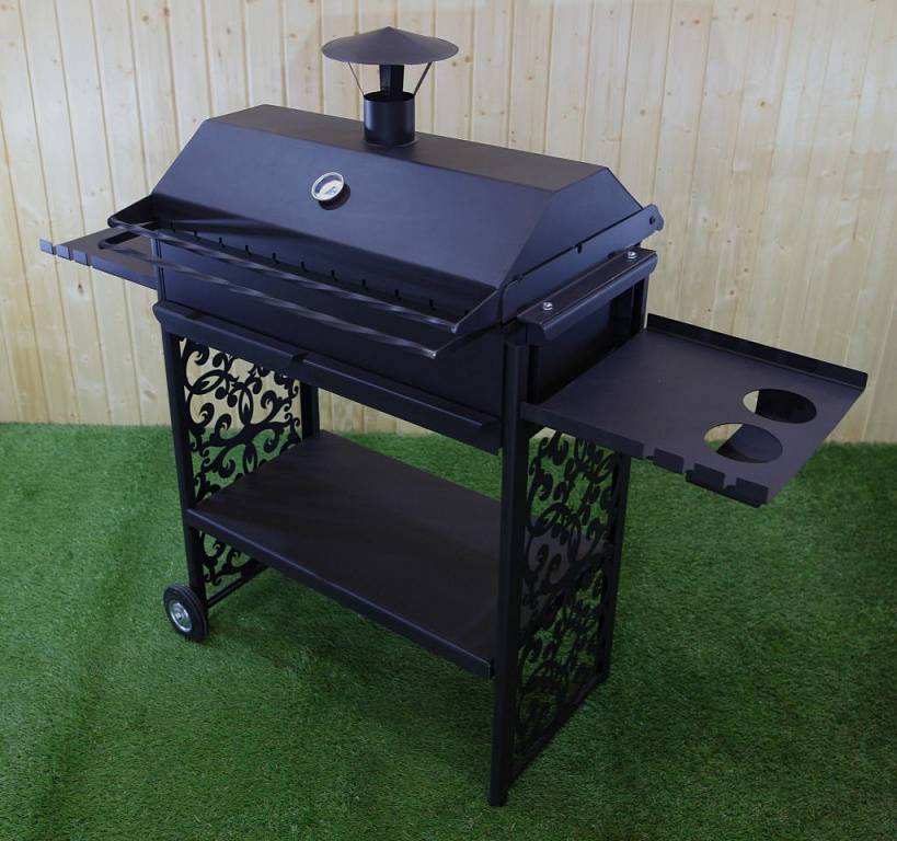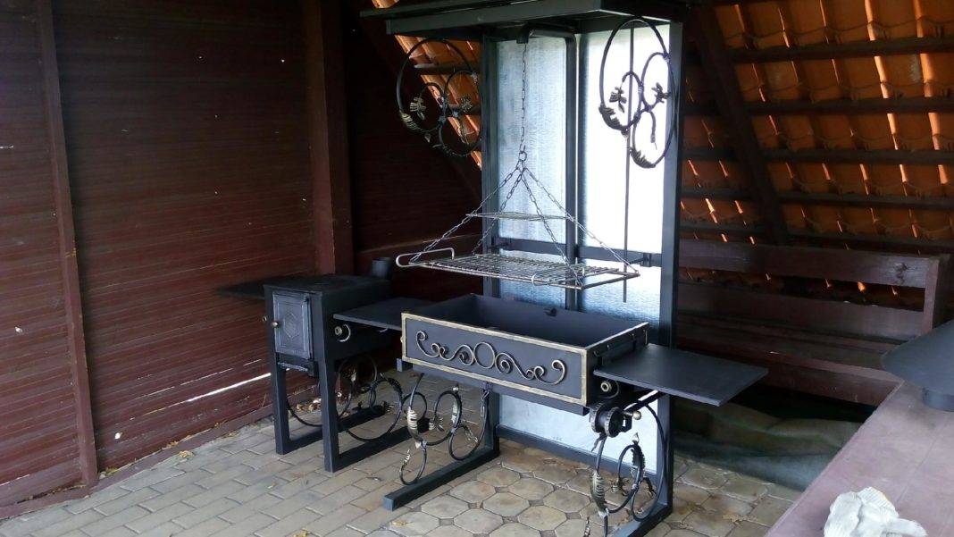 - Стационарная конструкция для дачного участка может быть украшена кованными элементами, быть выполнена из толстой стали. Оснащена навесом, откидными столиками, колесиками.
