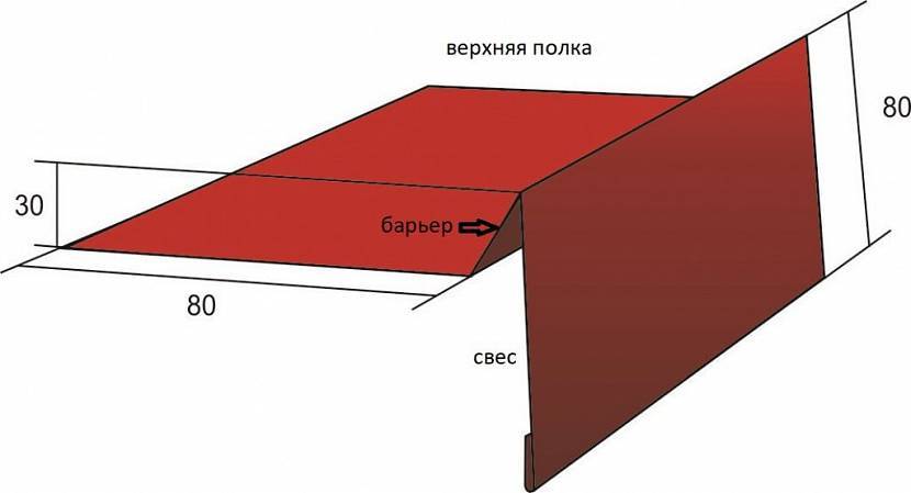 Этот своеобразный отлив с выступающим на нем загибом приходится крепить снизу ската непосредственно к лобовой доске. Длина детали обычно такая же, как у торцевой – 2 м, а параметры иные: 100х70 либо 150х100 мм.