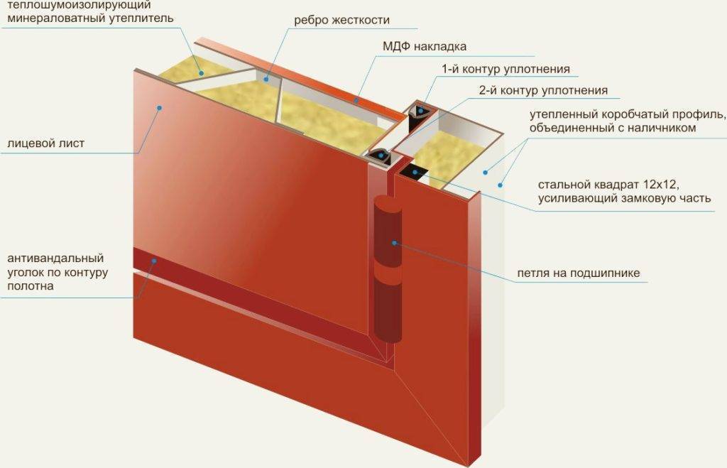В качественных изделиях на каркас из профильной трубы укладывается два листа горяче- (стоит дешевле, но ржавеет) или холоднокатаной стали (дороже, но долговечнее). Между ними располагается утеплитель (а есть и такие модели, где и в центре находится только сталь) и дополнительные ребра жесткости