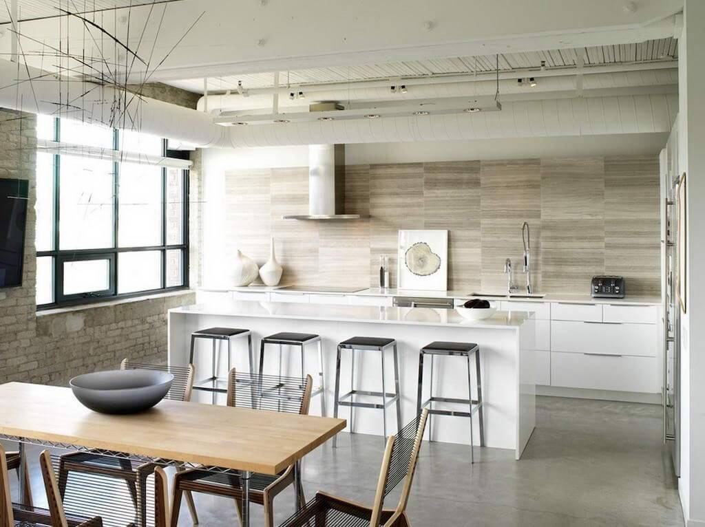 Это один из самых простых способов сделать хорошо очищаемую и устойчивую к различным факторам поверхность. Обычная кирпичная стена покрывается достаточно толстым слоем лака. В этом случае удается сохранить фактурность и красоту кирпичной кладки и при этом получить достаточно легкоочищаемый фартук, который окажется еще и очень долговечным. Идеальный вариант для кухни в стиле лофт.