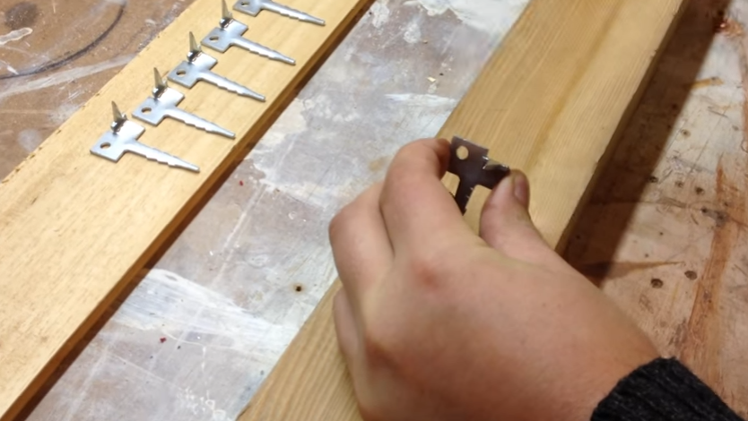 - Крепёжные элементы с шипами обеспечивают надёжное крепление досок с гладким краем без шипов и пазов. По внешнему виду они имеют названия: ключ, кобра, кошка. Основным принципом их действия, является наличие штифта с насечками в виде гвоздя. Шляпка имеет отверстие под гвоздь и шипы, заострённые и согнутые под углом в 90.