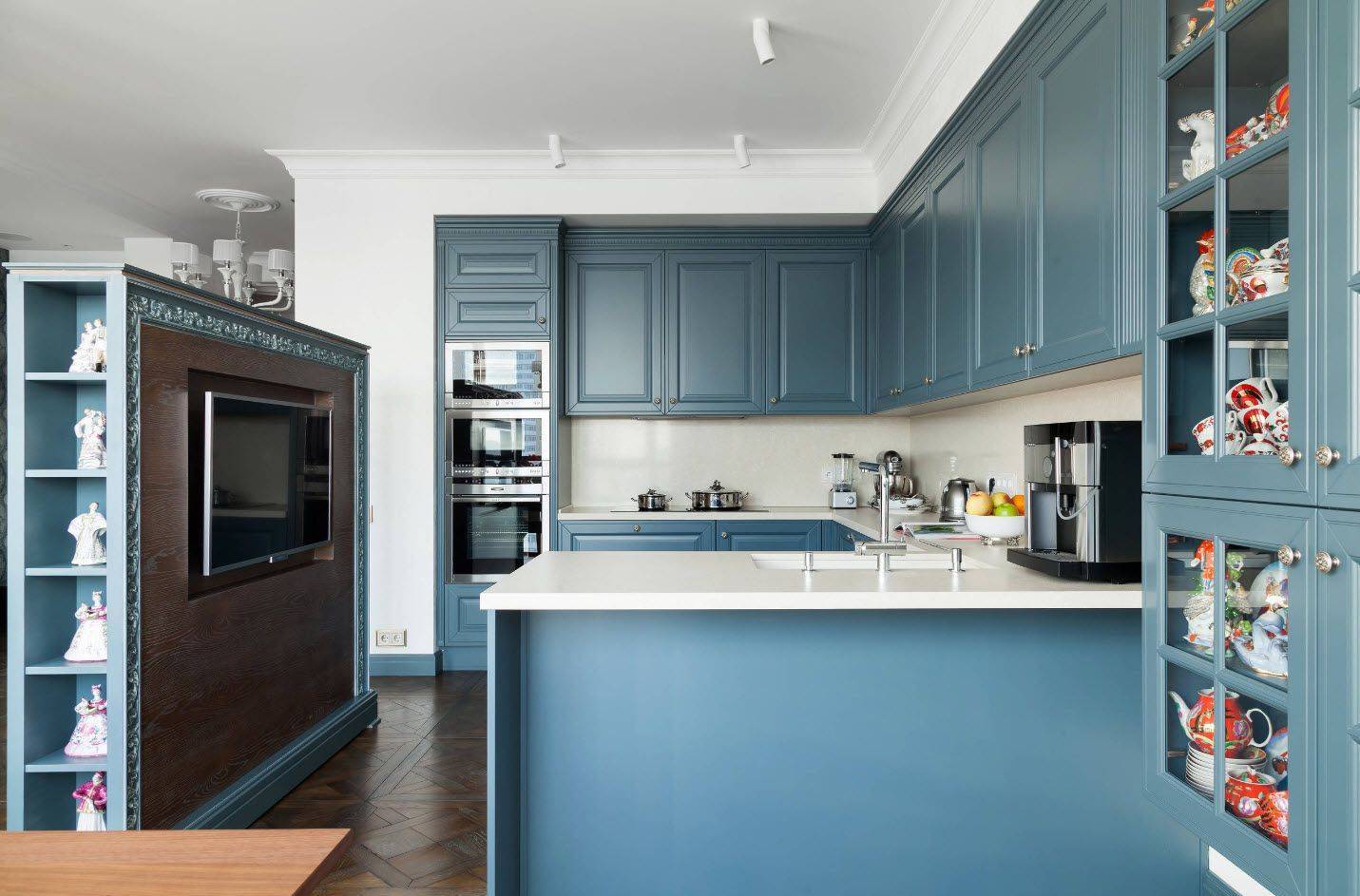 Кухня-ниша должна быть отделена от жилой комнаты дополнительным предметом мебели. Это может быть декоративный книжный шкаф.