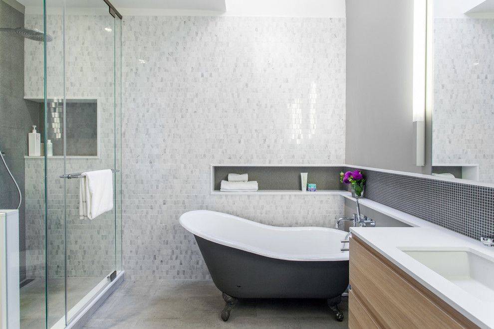 Узкая ниша по всей стене ванной комнаты служит декорирующим элементом и очень удобна для размещения всего необходимого