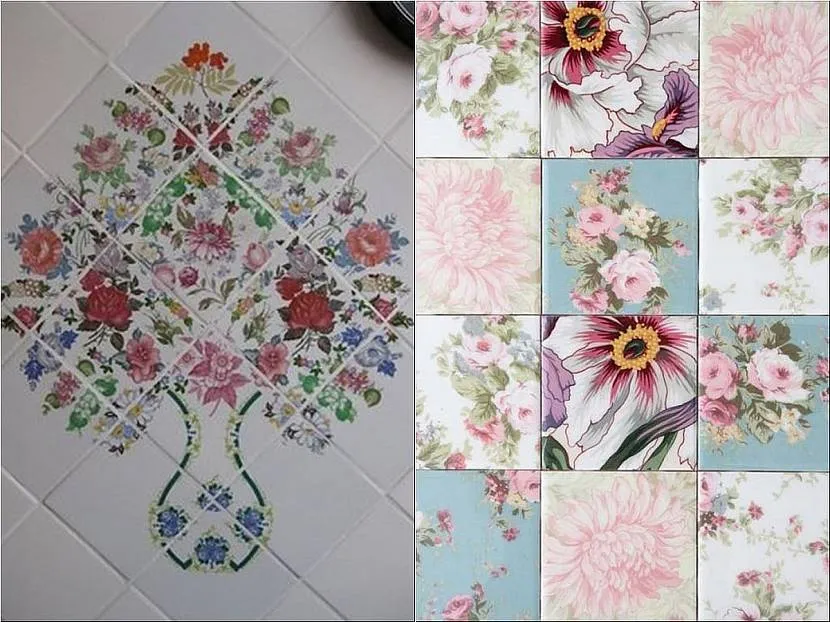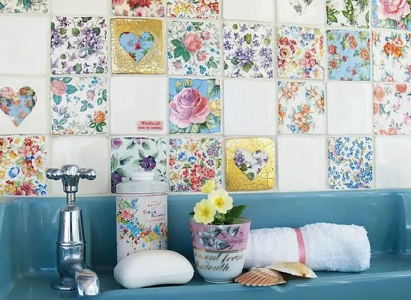 Бюджетный вариант применяют для однотонной, ровной керамики. За счет чередования или повтора картинок создается эффект декоративного кафеля. Перед нанесением поверхность тщательно моют и обезжиривают, иначе бумага неравномерно прилипнет.