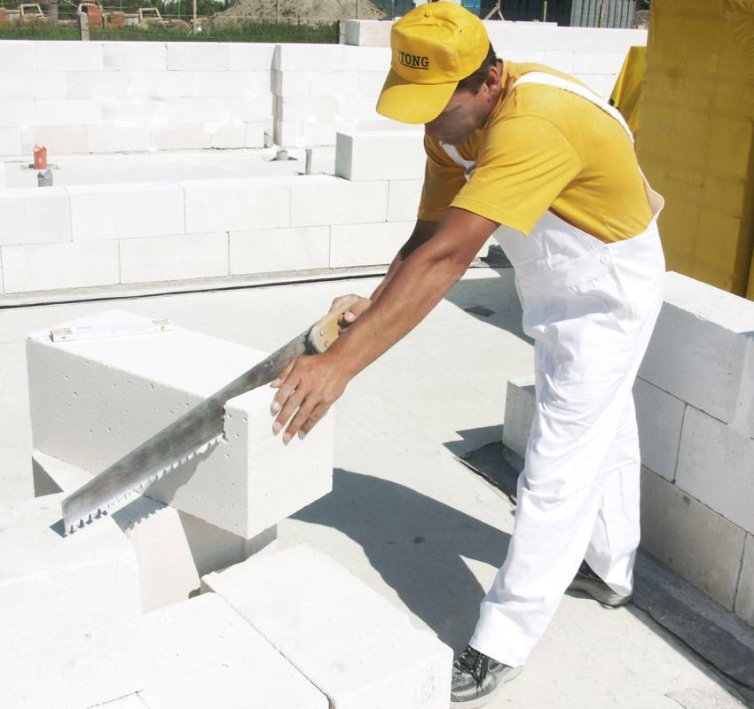 Этот тип блоков обладает еще одним привлекательным свойством. Благодаря особой структуре он легко режется обычной пилой. Таким способом можно быстро подкорректировать параметры и получить нужный размер газобетонного блока для строительства дома.