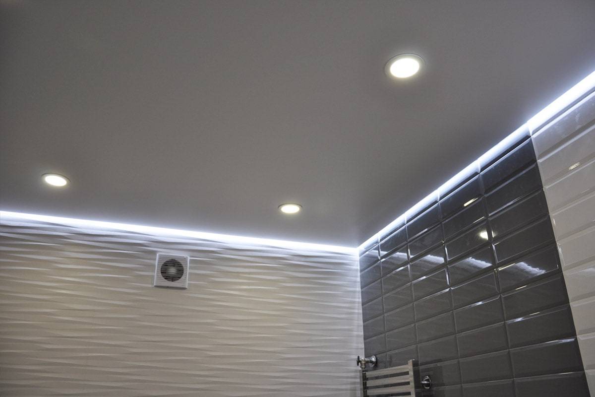 Такие потолки прекрасно подходят для ванной, они не пропускают пар и обладают хорошими влагоотталкивающими свойствами. Модели в светлых тонах мягко рассеивают свет, а значит и расширяют границы потолочного пространства, что особенно хорошо для малоформатных комнат.