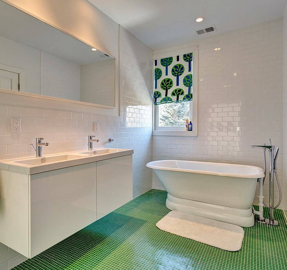 Кто-то предпочитает белый кафель, голубой или синий, потому что эти цвета ассоциируются с чистотой и водной гладью. Другие подобное решение сочтут излишне казённым, «больничным», отдав предпочтение насыщенным летним краскам. Лучшим выбором может стать – золотая середина, сочетание тепла и холода: васильковый или аквамариновый можно «подружить» с яично-жёлтым, мятным, земляничным… Добиться этого просто не только с помощью разноцветной керамической плитки, но и привычных предметов обихода – шторки, полотенец, мыльниц и подставок.