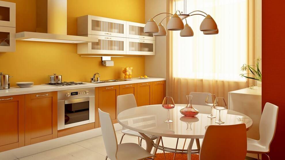 В отношении семейной кухни все предельно понятно – это место, в котором готовится и употребляется вкусная пища, а поэтому исходя из этого, дизайнеры советуют использовать цвета, способствующие прекрасному настроению и аппетиту. К таковым относят: оранжевый либо зеленый, желтый, либо бежевый