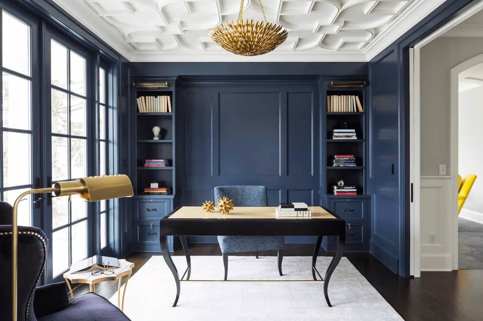 Кабинет, библиотека, комната студента должны настраивать на размеренный рабочий ритм. Содействует этому синий, но если с ним перестараться – помещение станет излишне «холодным». Избежать этого можно, добавив шторы и пледы светло-коричневого, льняного, терракотового цвета.