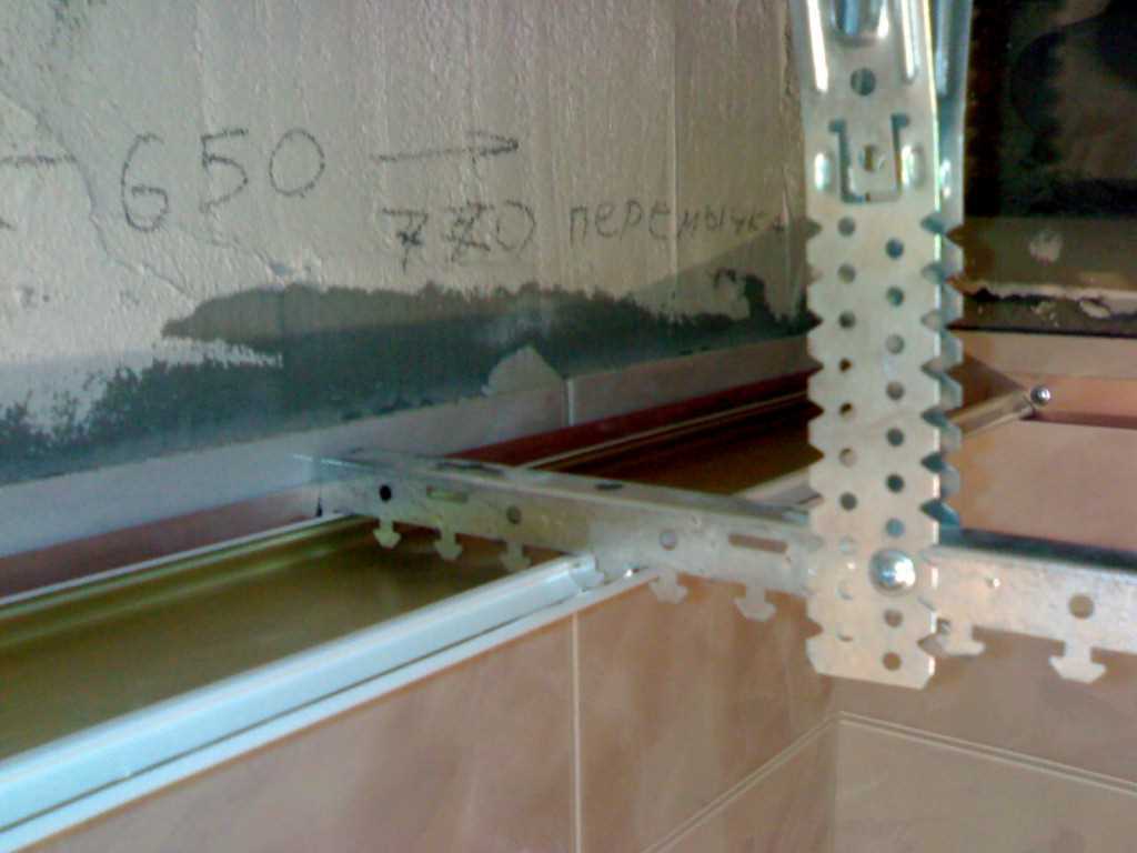 - перед монтажом каркаса определяют самый низкий угол в помещении, измерив их рулеткой от пола до потолка. Нижняя точка – основная высота при монтаже ПВХ. От нее размечают горизонтальный контур по периметру комнаты для дальнейшего монтажа каркаса;