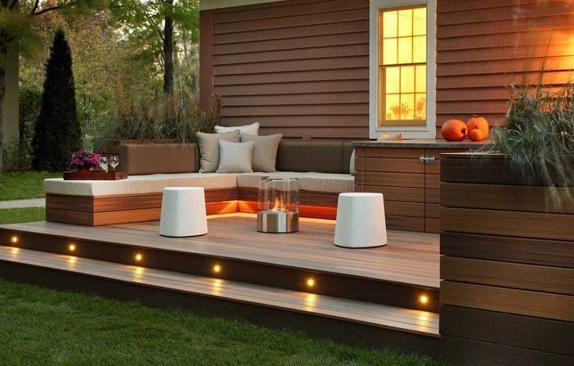 На небольших участках можно без беседки и сэкономить финансы на ее строительстве. Открытая площадка поднимает статус жилья. Она выглядит стильно, чем традиционные веранды.