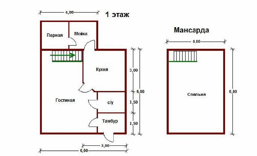 Планировка дачного дома маленькой площади (до 40 метров) совсем проста: обычно это две комнаты, первая из которых используется как кухня и столовая одновременно. Чаще всего она является проходной. Вторая комната жилая. Более-менее комфортно разместить тут можно два спальных места. Так что проекты дачных домов с мансардой 6*4 метра рассчитаны на проживание 1-2 человек.