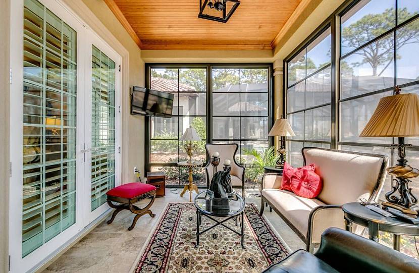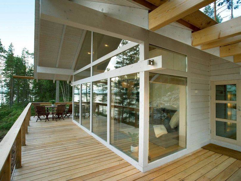 - Остекление. Может быть постоянным или сезонным. Оконные элементы чаще всего размещаются по всему периметру. Для панорамного остекления используют обычные оконные блоки и стеклопакеты (как с пластмассовым, так и с деревянным профилем). Веранда с большой площадью остекления обеспечивает отличную внутреннюю инсоляцию (поступление солнечного света). Для защиты от солнечных лучей используют шторы, жалюзи, ставни и экраны.