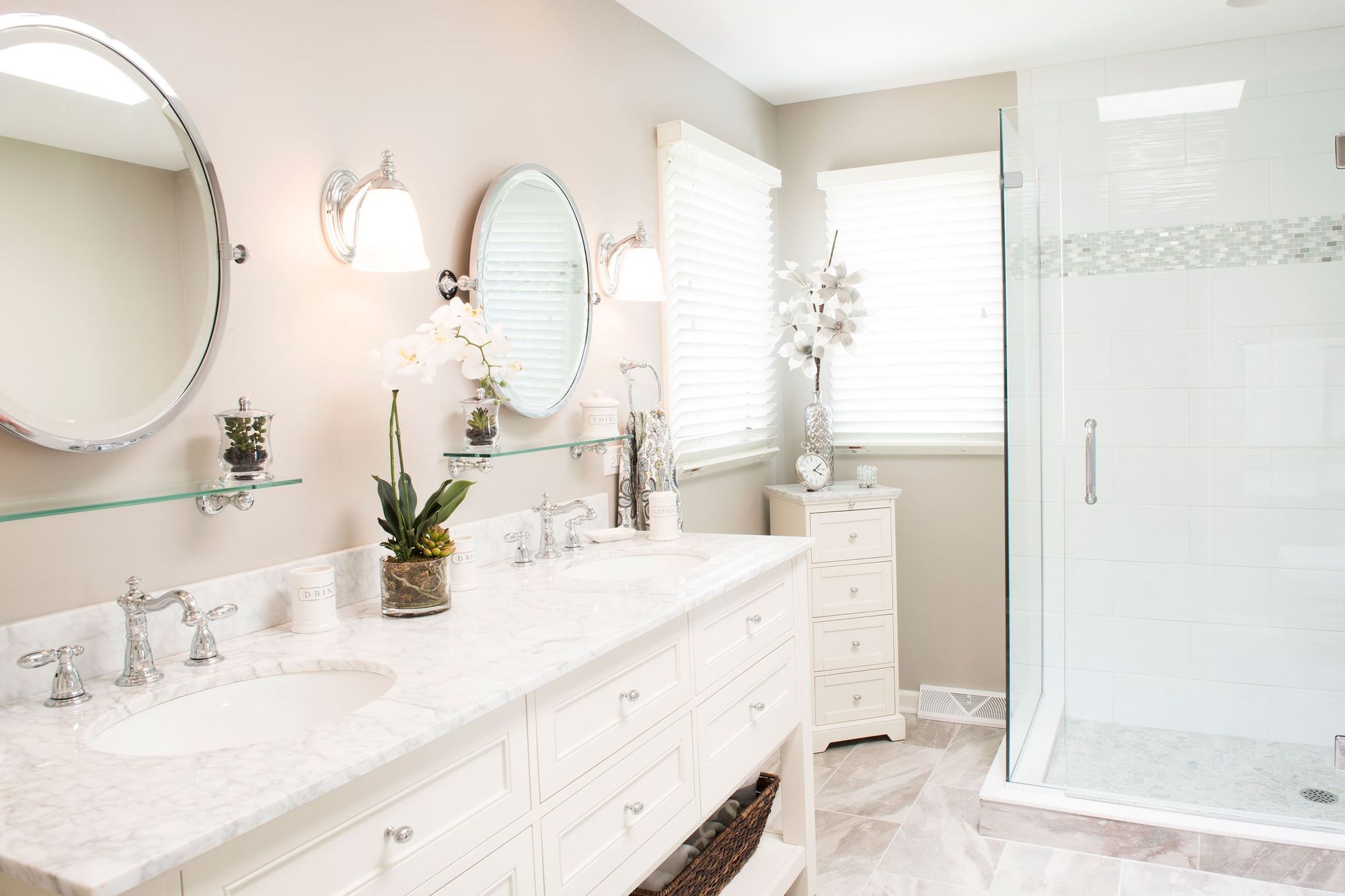 Задачу второстепенного освещения выполняют светильники у зеркала — бра или споты. Они-то как раз и справляются с освещением вашего лица.
