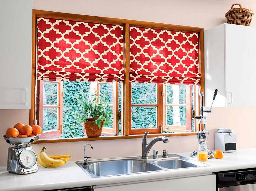 - Повторяют размер, не перегружая интерьер. Короткие римского вида шторы – идеальная модель занавесей для тесных кухонь;