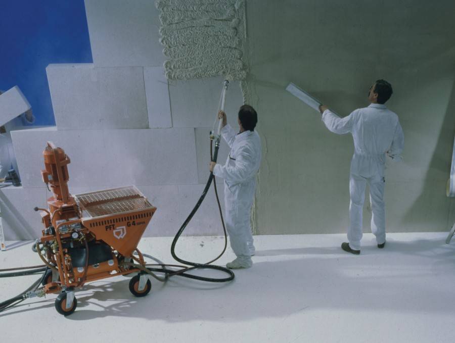И в 1962 году компания Кнауф на своем производстве, расположенном в Западной Германии, начала производство сухих смесей Ротбанд, расход которых на каждый замес заметно увеличился по сравнению с прежней технологией, а наносить готовый раствор стало проще. Технологи предприятия разработали точную рецептуру для замешивания смеси с точными пропорциями сухого вещества и воды, временем выдержки и нанесения.