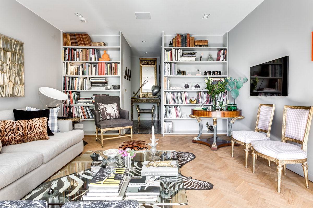 В гостиной за счет домашней библиотеки, получается добиться по-настоящему эстетичного дизайна. Место рядом с полками, можно превратить в уютный уголок для чтения, оформив его мягким диванчиком или удобным креслом в сочетании с торшером.
