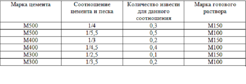 Ниже приведена таблица соотношения основных компонентов с указанием марки используемого цемента и марки готового раствора. Пропорции для извести приведены справочно, её добавление не обязательно и не меняет соотношение основных частей.