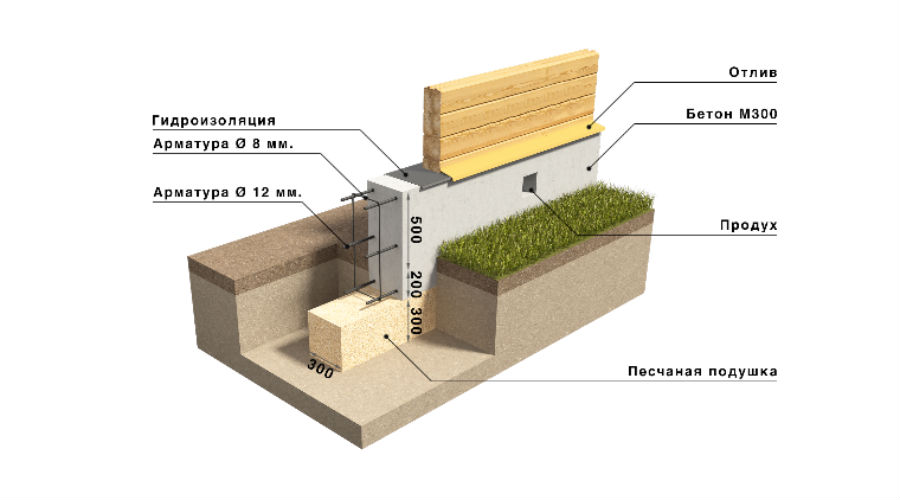 Ленточный вид основания мелкозаглубленного типа имеет высоту 60-80см. Внешне он напоминает монолит из железобетонных лент. Стоит отметить, что расчет и затраты на такой фундамент требует минимальных ресурсов. Поэтому, выбрать такой вид оптимально при строительстве легких зданий, например построек из бревна.