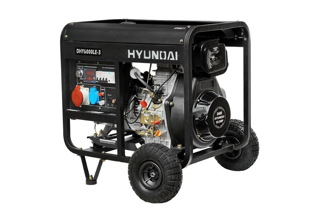 Один из лидеров рейтинга — мощная универсальная дизельная модель Hyundai DHY-6000 LE-3. Он оснащена 14-литровым баком для топлива, мощным двигателем на 10 лошадиных сил с рабочим ресурсом 1500 часов. Генерируемая мощность составляет 5-5.5 кВт при силе тока 13.7 А. Это позволяет обеспечить питание розеток на 220 В, 380 В и 12 В. В дополнительное оснащение входят вольтметр, система защиты от перегрузки, счетчик моточасов, шумовая защита и колесная ось для перемещения прибора. Такой генератор рекомендуют выбирать для стационарного использования.