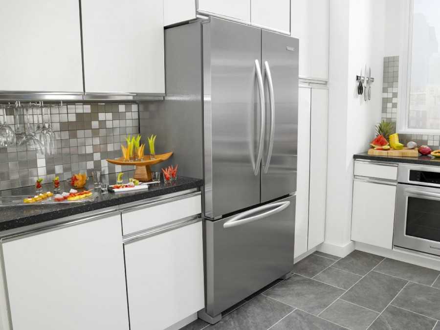 Оформление подбирается, исходя из общей стилистики кухонного помещения. Наибольшей популярностью пользуются распашные металлические, цветные и ретрохолодильники.