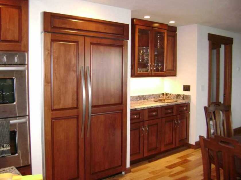 Модели встраиваемых холодильников обшиваются материалом, аналогичным фасаду кухонного гарнитура