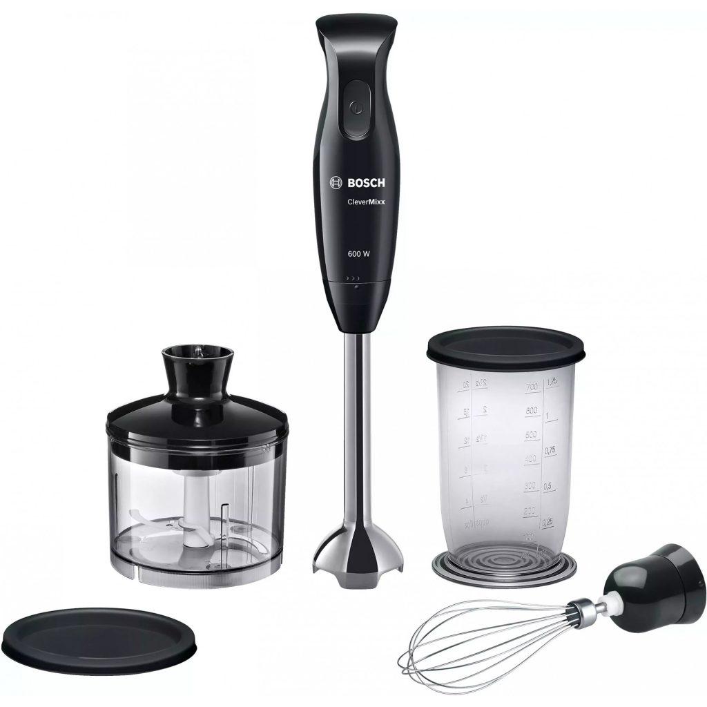 К примеру, Погружной блендер Bosch ErgoMixx MSM66150RU стоимостью в 3 300 рублей. Имеет всего 3 насадки, но 12 режимов скоростей, корпус и дополнительные чаши изготовлены из пластика, мощность прибора до 600 Вт. В базовой комплектации вполне хватает и небольшого количества насадок, которые потом можно докупить отдельно.