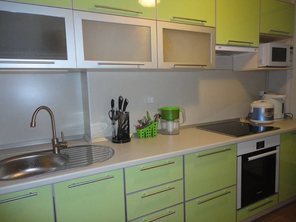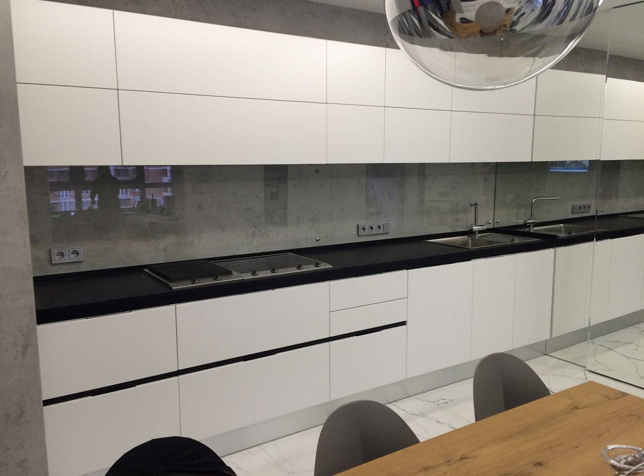 Стекло придает особую элегантность кухне, можно выбрать различные цветовые решения, не боится воды и температуры. Сложность очистки и низкая стойкость к ударам делают его менее привлекательным.