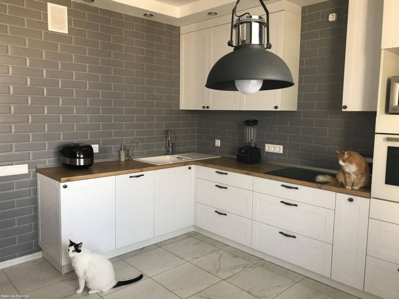 Вне конкуренции — керамическая плитка. Как обычная, под классический белый, розовый или любого иного цвета кабанчик, так и керамогранитная — мощными плитами, имитирующими бетон и камень. Как правило, они имеют большой размер и сразу закрывают все фартучное пространство.