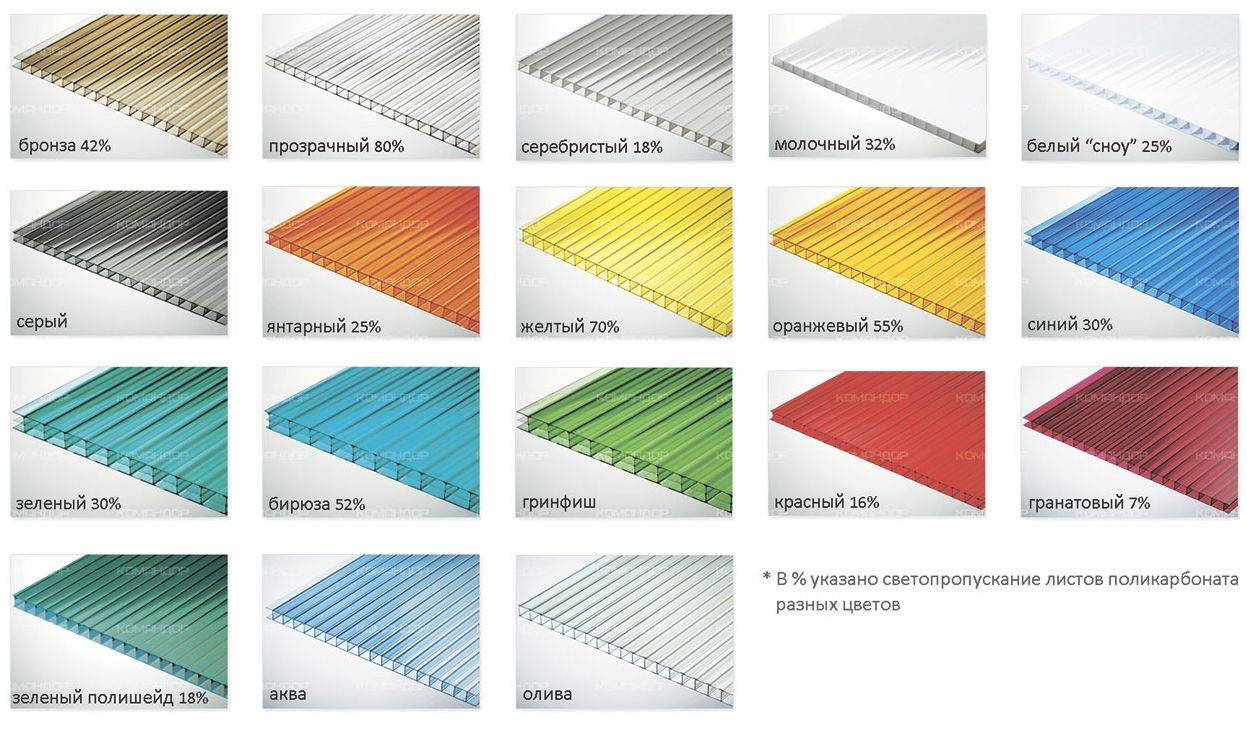Цвет профилированного поликарбоната может быть различным, как и степень прозрачности. Прозрачный поликарбонат бывает бесцветным и цветным, он пропускает от 60% до 95% солнечных лучей. Полупрозрачные листы могут быть окрашены в любой цвет, в том числе в дымчатые и матовые оттенки. Непрозрачные листы, как правило, имеют сочные и яркие цвета, иногда используют белый, молочный и бежевый.