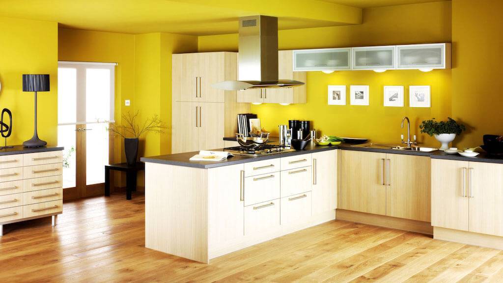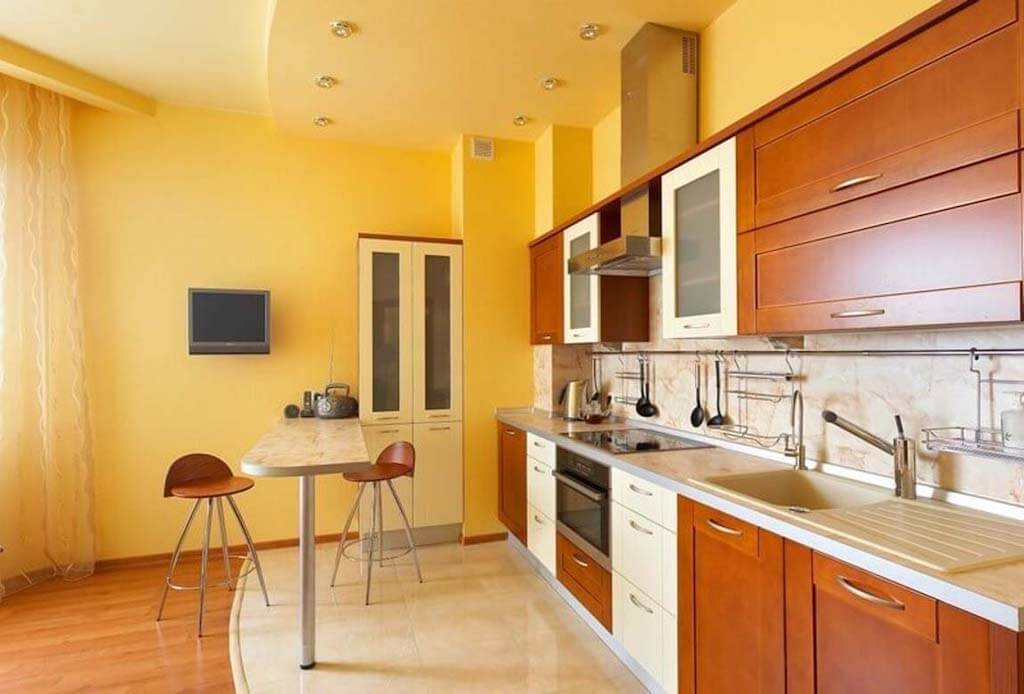 Лучше выбирать светлые тона оформления, которые немного отличаются оттенком от потолка. Такой прием поможет сделать кухню не только шире, но и заметно выше.