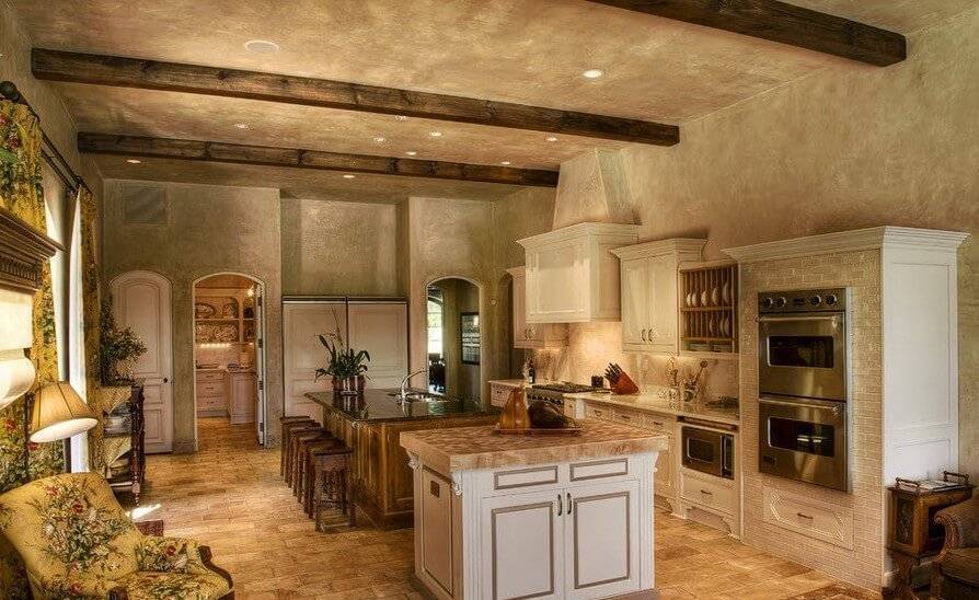 Такой тип отделки предназначен только для больших высоких кухонь. Лучше всего прибегать к установке нескольких уровней при необходимости отделить кухонное пространство от гостиной с помощью ГКЛ. Такие композиции могут быть очень сложными, конструкции подобного типа монтируются специалистами до недели. Также высокие стены позволяют использовать балки, которые хорошо впишутся в интерьеры в стиле прованс, кантри, лофт и пр.