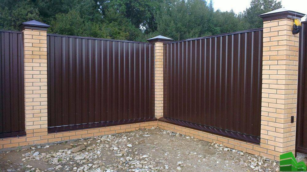 - возможность комбинировать профнастил с другими стройматериалами: кирпичом, камнем, поликарбонатом;