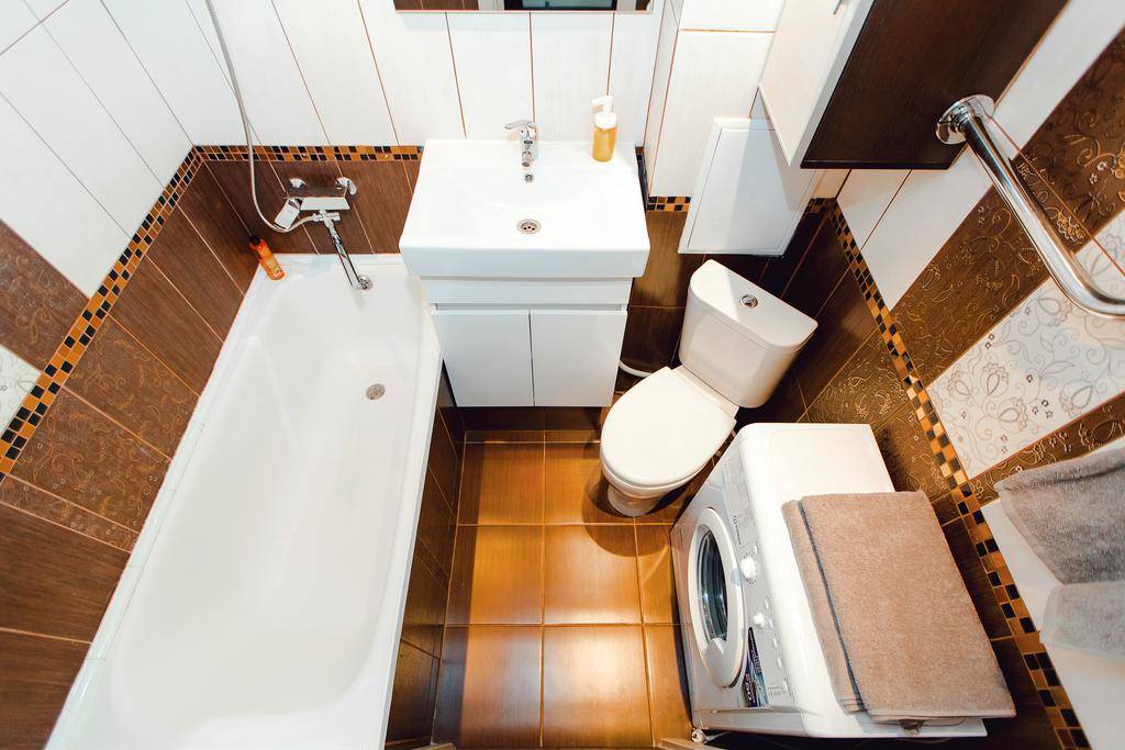 Недостатком считается то, что здесь не остается места для стиральной машинки, что, однако, легко решается ее размещением под раковиной. Вариант удобен тем, что отпадает необходимость перепланировки всего санузла.