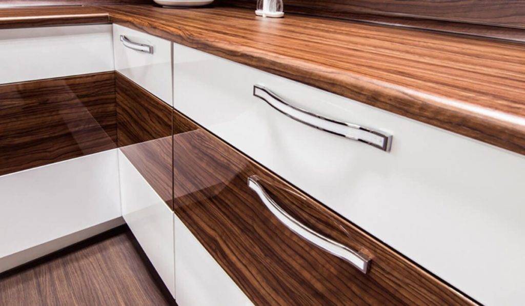 В этой ситуации критически важно сохранить хотя бы намек на целостность интерьера, поэтому совпадать должны не только материал и расцветка, но и толщина изделия. Если для основной столешницы выбрана плита размером 38х3000х850 мм, как идеально подходящая к габаритам помещения, а для Г-образного ответвления нужен еще кусочек длиной в метр (при том, что короче двух метров такие плиты не делают), высокие затраты на лишний материал все равно будут обоснованными