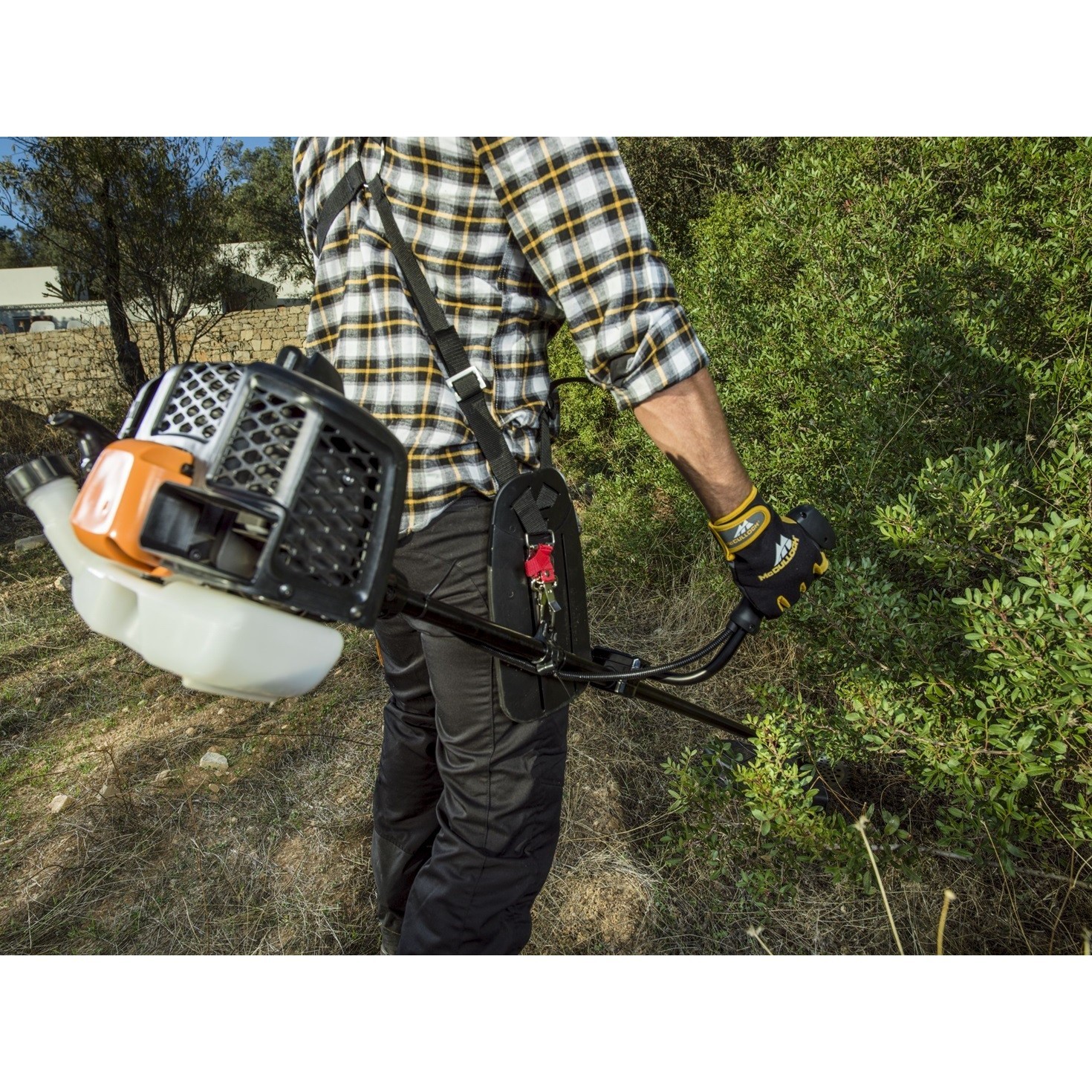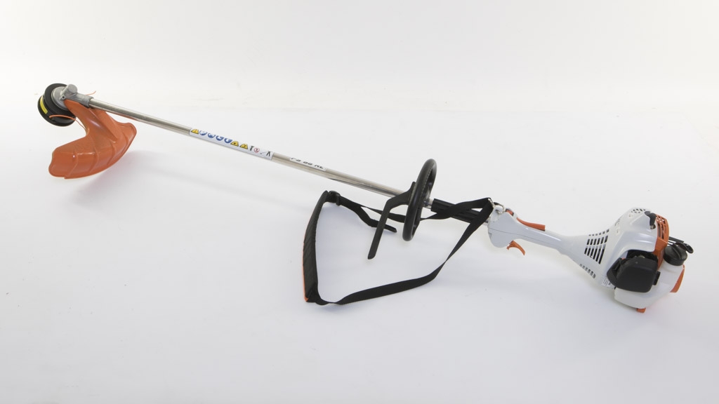Главная особенность – разборная конструкция. Для решения этой задачи установлен гибкий приводной вал. Подача корда полуавтоматическая, рычаги управления вынесены на рукоятку велосипедного типа, которую можно настроить под пользователя. Антивибрационная демпфирующая система снижает физическую утомляемость, нагрузку на кисти. Для переноски используется наплечный ремень.
