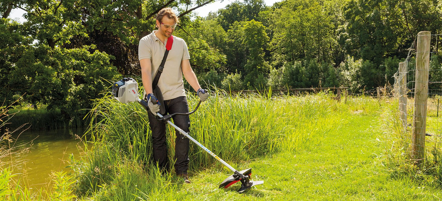 Двухтактный бензиновый триммер немецкого бренда. Он предназначен для скоса любых видов трав и бурьяна. Двигатель экономичен и заправляется топливной смесью масла и бензина (пропорции 1 к 25). Благодаря наличию праймера прокачки топлива, двигатель легко запускается. Элементы управления находятся на правой ручке, поэтому инструмент прост в эксплуатации. Утомляемость в процессе работы значительно снижена, это заслуга «велосипедных» рукояток и наплечного ремня. Бачок для топлива прозрачный, изготовлен из прочного пластика. Поэтому легко регулировать уровень смеси в процессе работы. В комплекте с прибором идет трехлопастной нож, леска, защитный кожух.