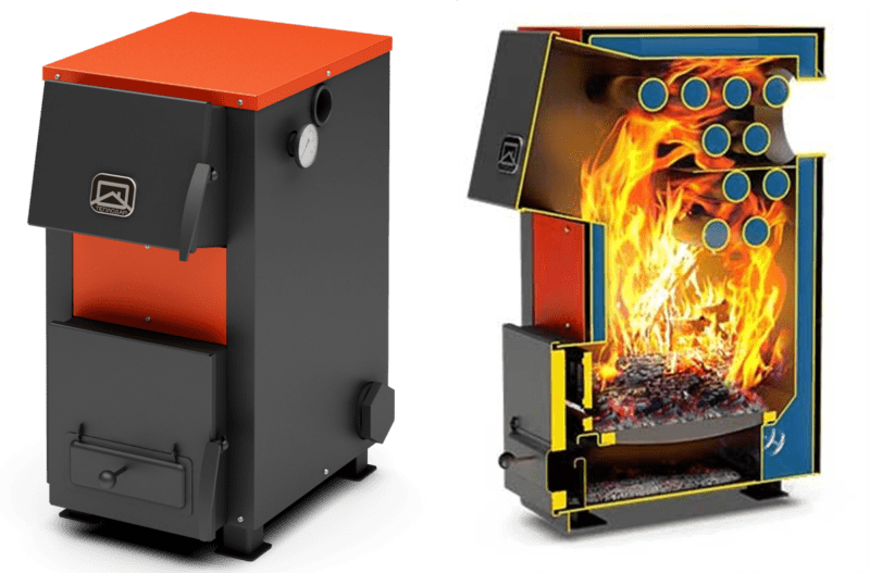 - Традиционный агрегат из чугуна или стали. По внешнему виду, конструкции топки и дымохода и по принципу действия такие приборы похожи на обычные печи. Работают они, как правило, на дровах или угле. Это вариант считается максимально простым и надежным. В нем не используются сложные электронные устройства, что делает стоимость агрегатов достаточно невысокой. Кроме того, автоматика нередко становится самым уязвимым местом: в традиционных котлах он просто отсутствует. Температура теплоносителя регулируется с помощью механического регулятора. Такие котлы работают без сбоев долгое время.